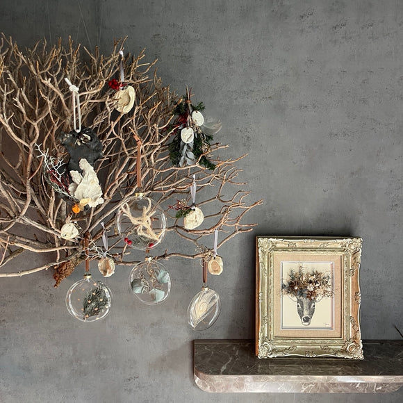 【ボタニカルチャイムオーナメント】シャーレ状のガラス容器に植物をアレンジしたパコスオリジナルオーナメント。透明感のあるオーナメントは、枯れ木にかけてシックでお洒落なツリーとしてシンボルツリーとしてのインテリアや一つでも華やかなので、プチギフトにもおすすめ。色の組み合わせで何通りも楽しめるインテリア性も高いオーナメントです。