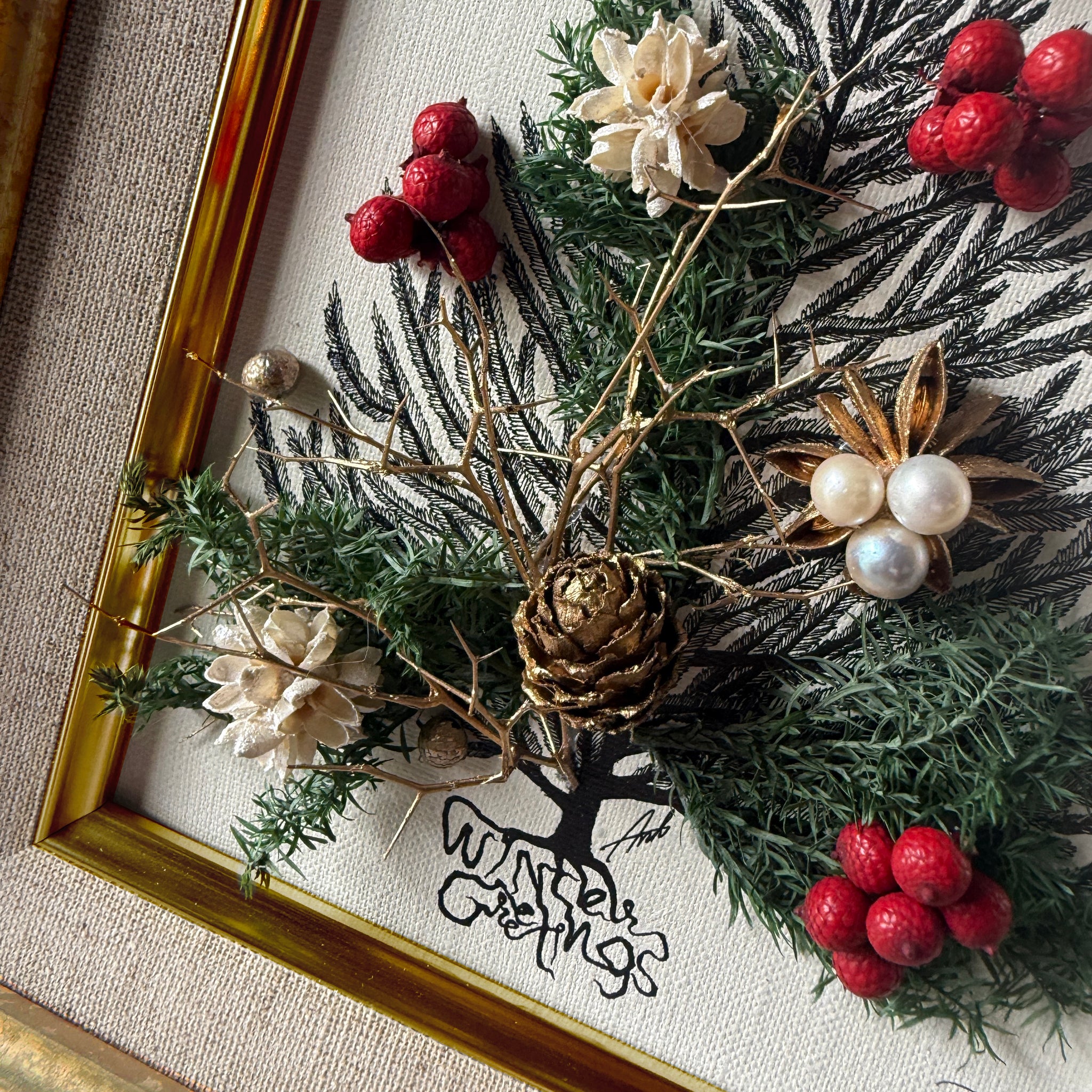 バロックパールレッドは、冬ならではのガラナの実や、松笠、スターアニスを使用し、思わず笑顔になるようなクリスマス気分がぐっと高まるアレンジ。