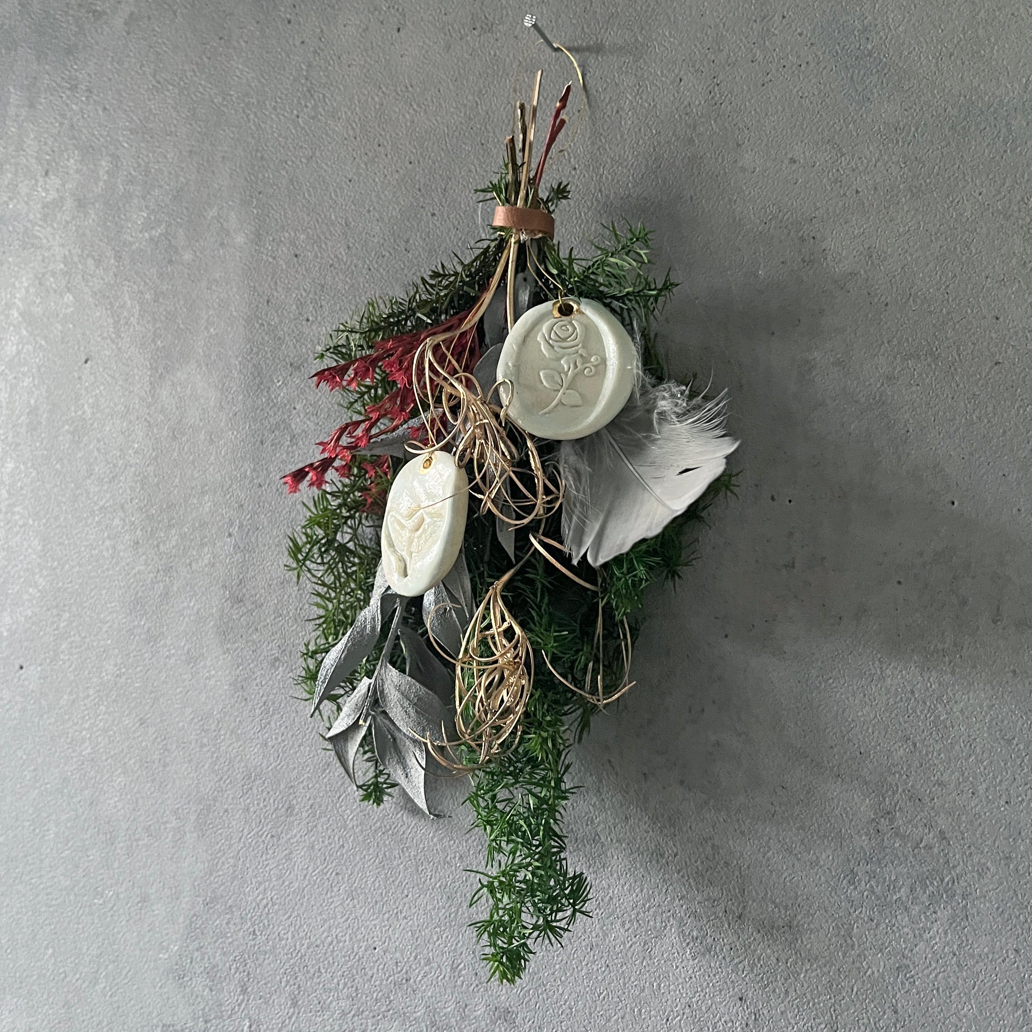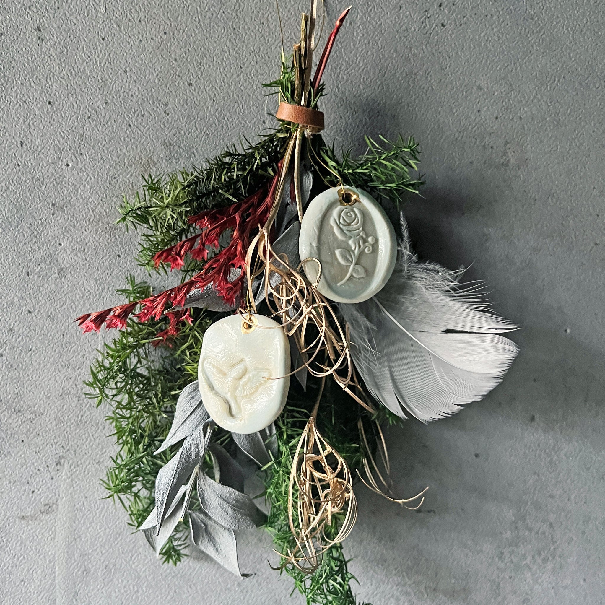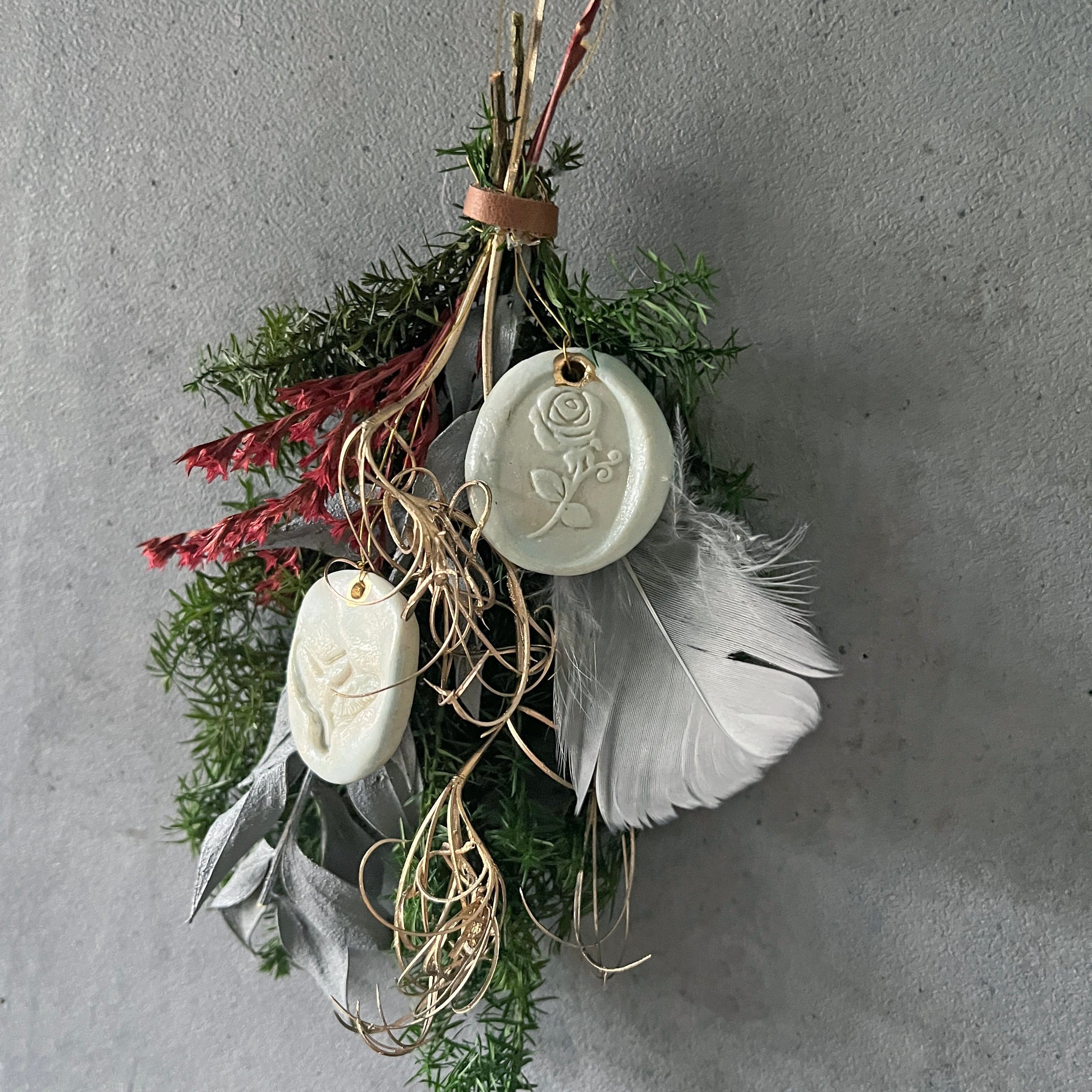 ひとつひとつにローズと鳩の型押しシーリングをしたセラミックオーナメントを、