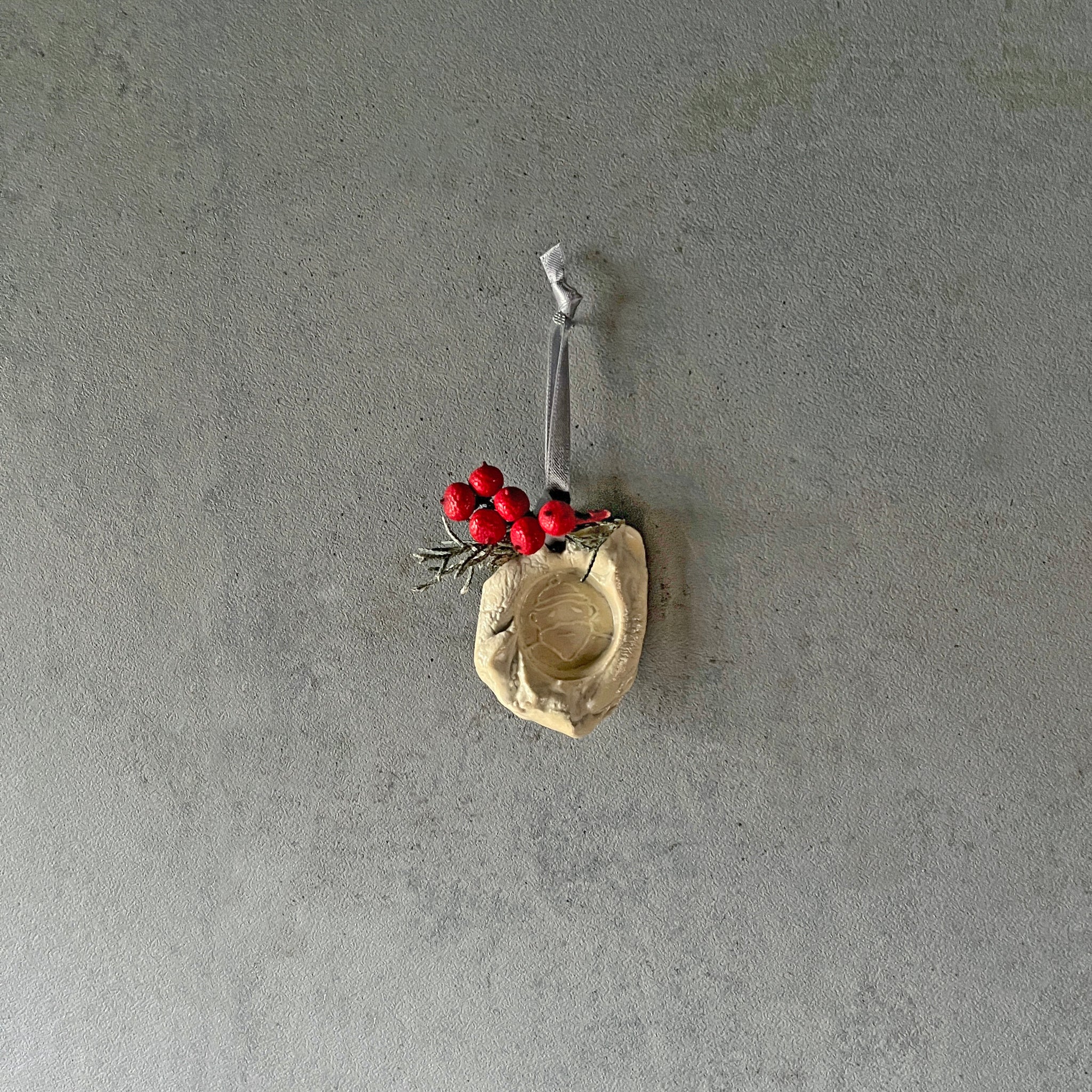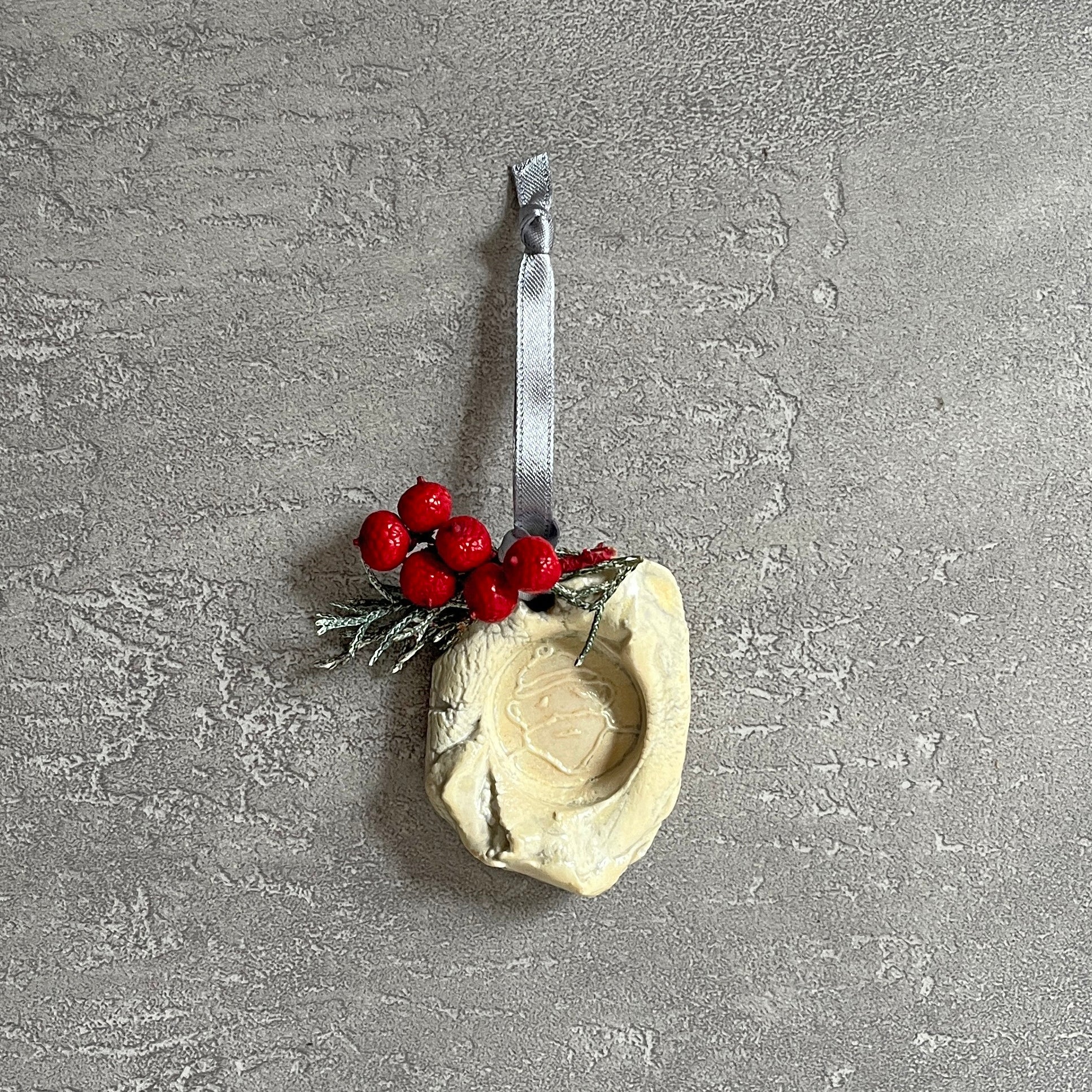 ひとつひとつにサンタクロースの型押しシーリングをした、セラミックオーナメント。