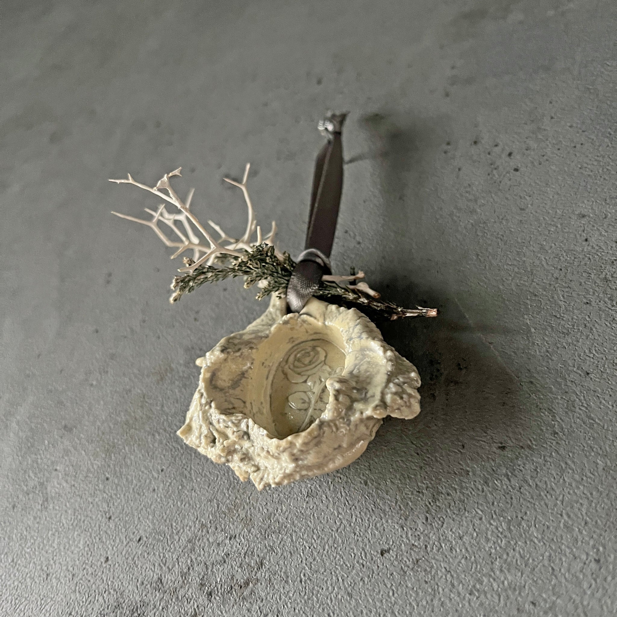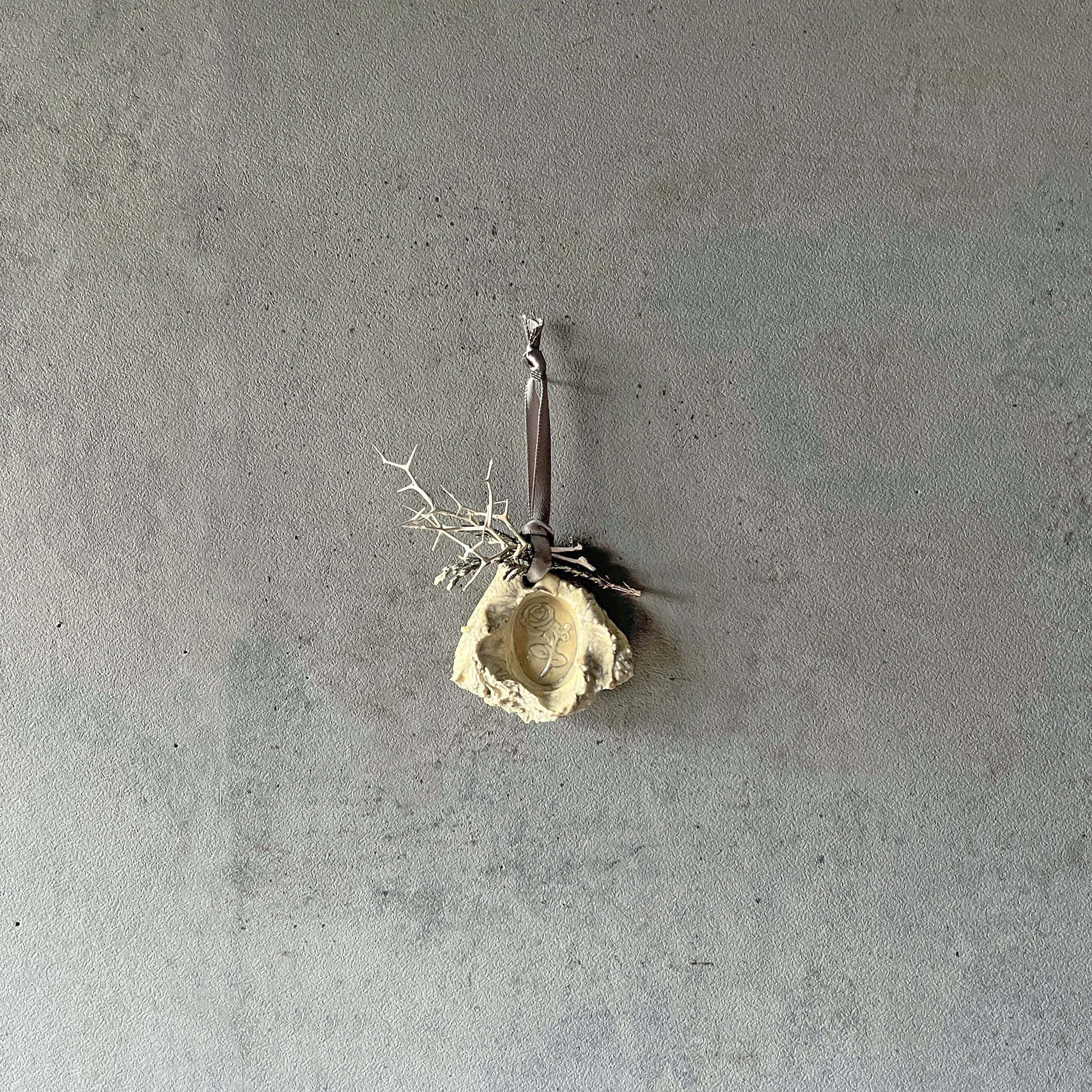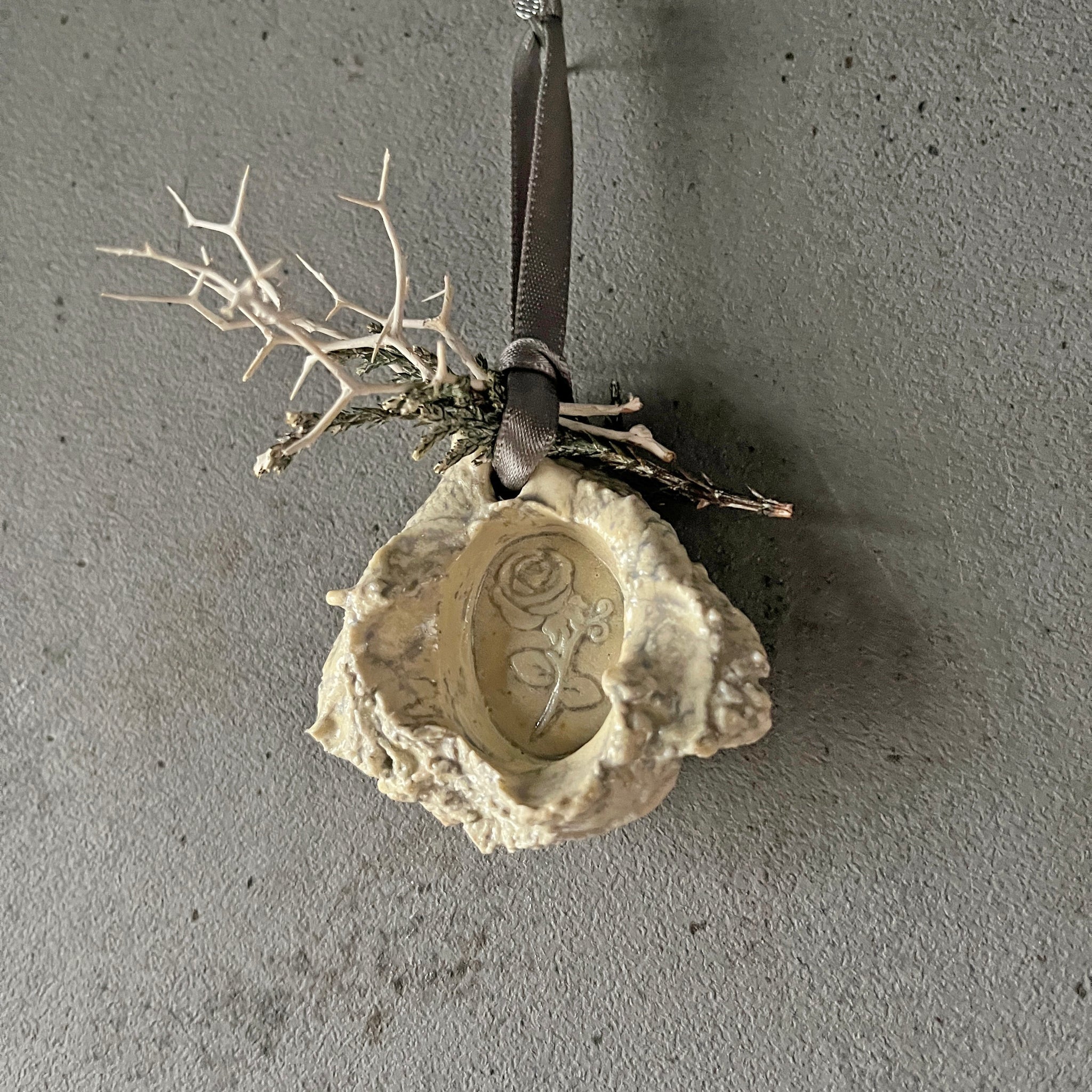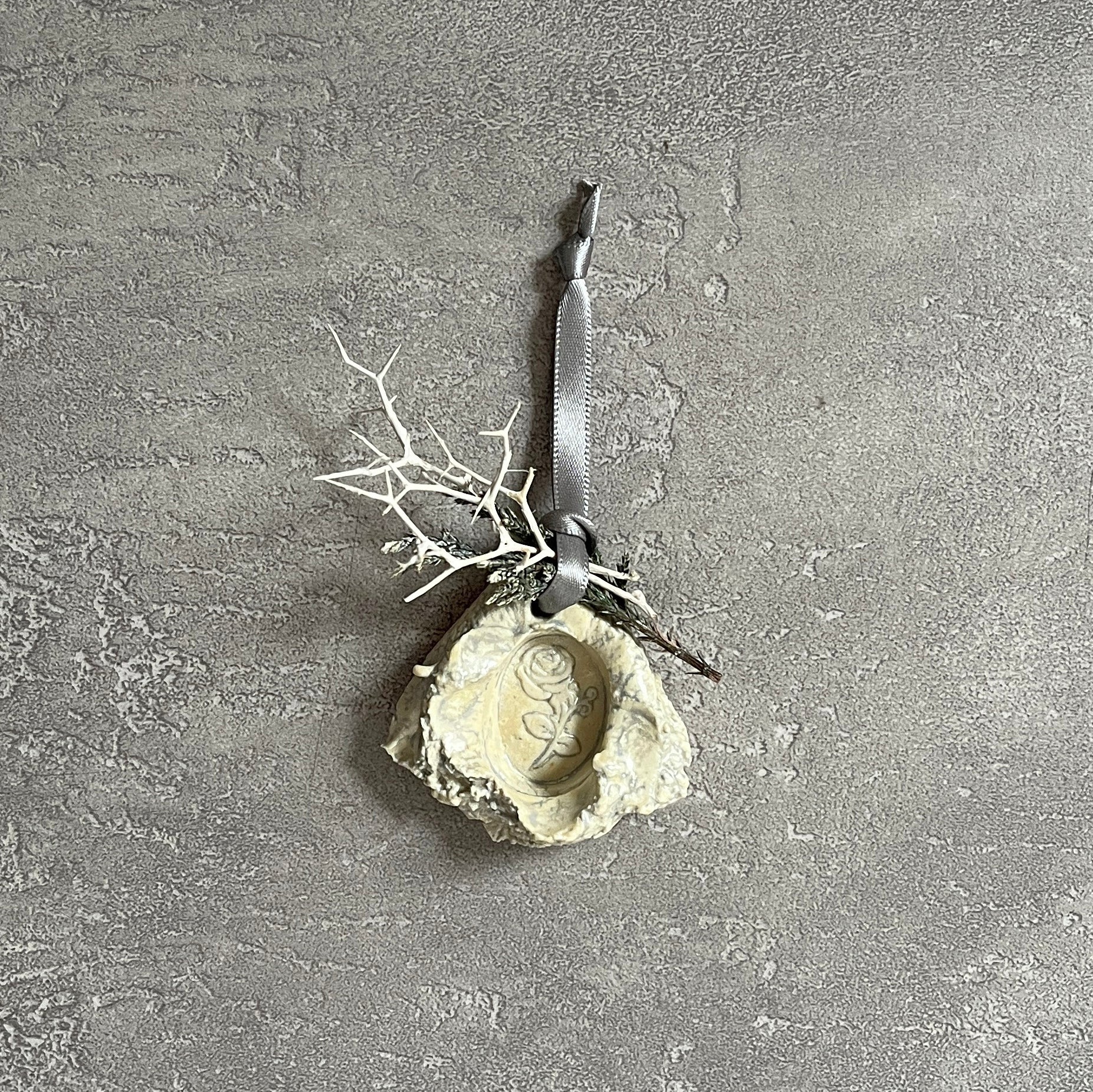 ひとつひとつにローズの型押しシーリングをした、セラミックオーナメント。