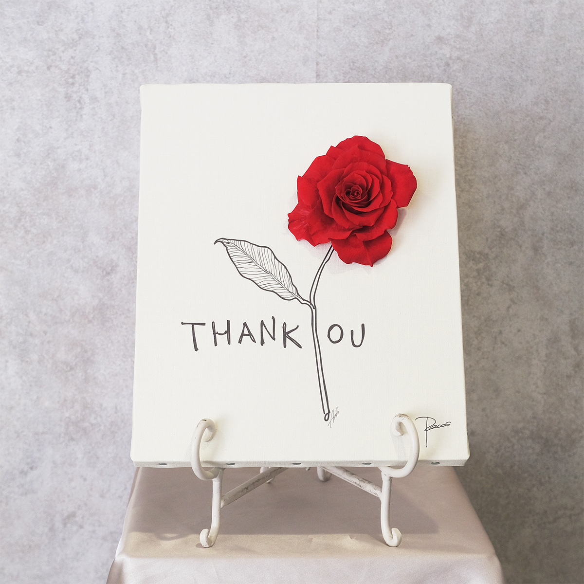 キャンバス地に描かれたイラストと、プリザーブドフラワーのコラボレーション。淡いピンクから深いローズピンクへと移り変わるグラデーションが、温かな感謝の気持ちを優しく彩ります。