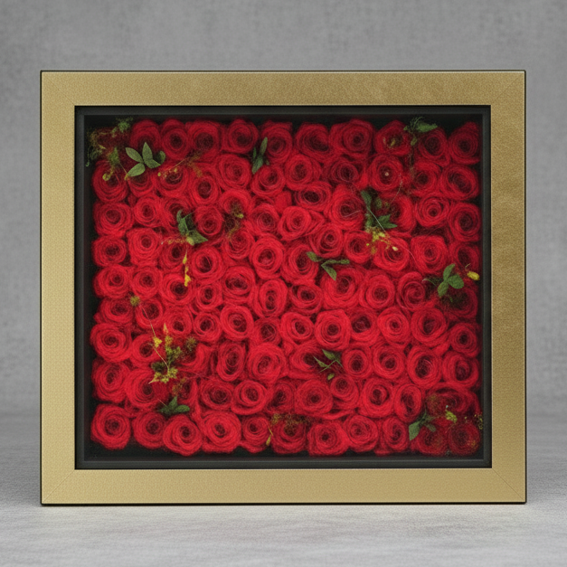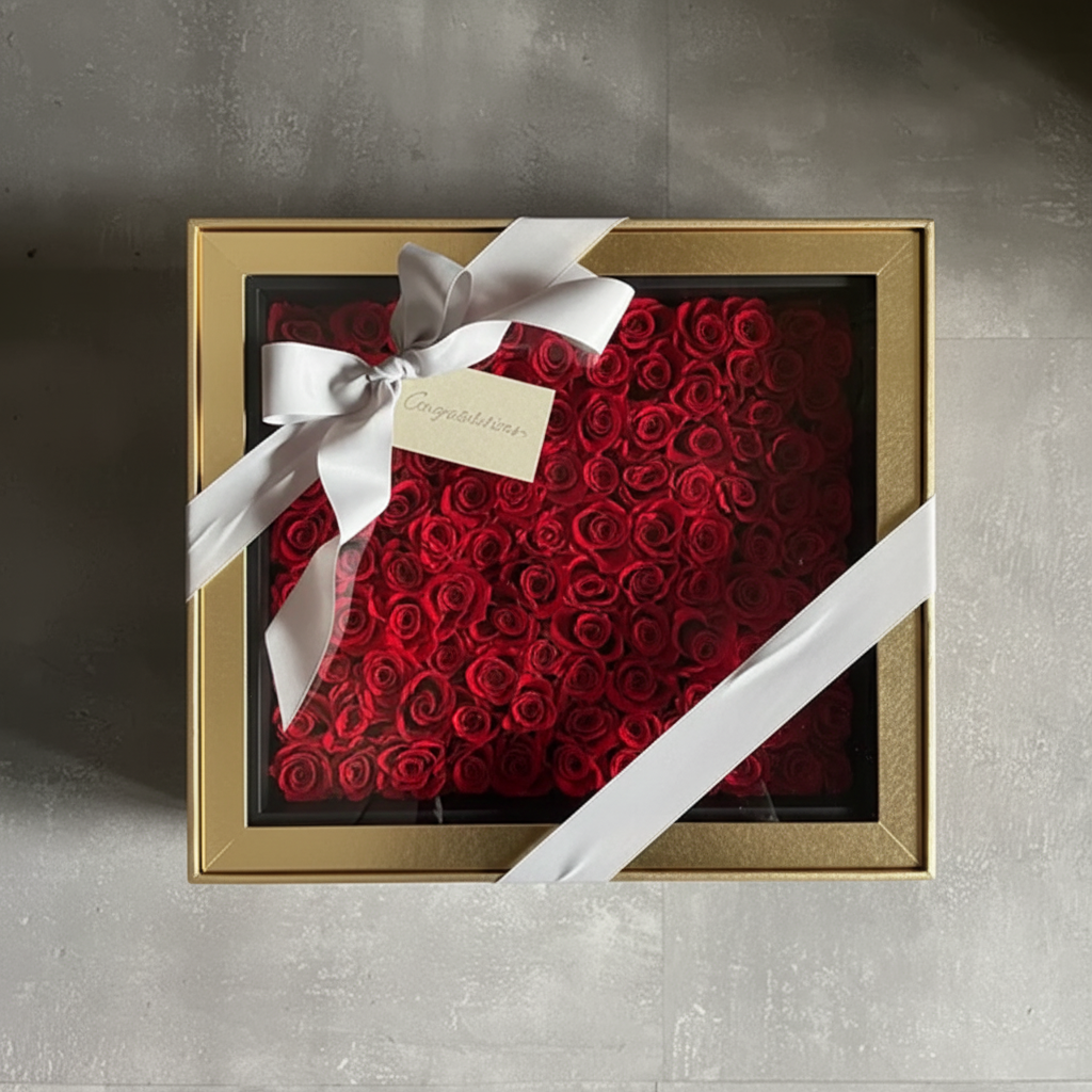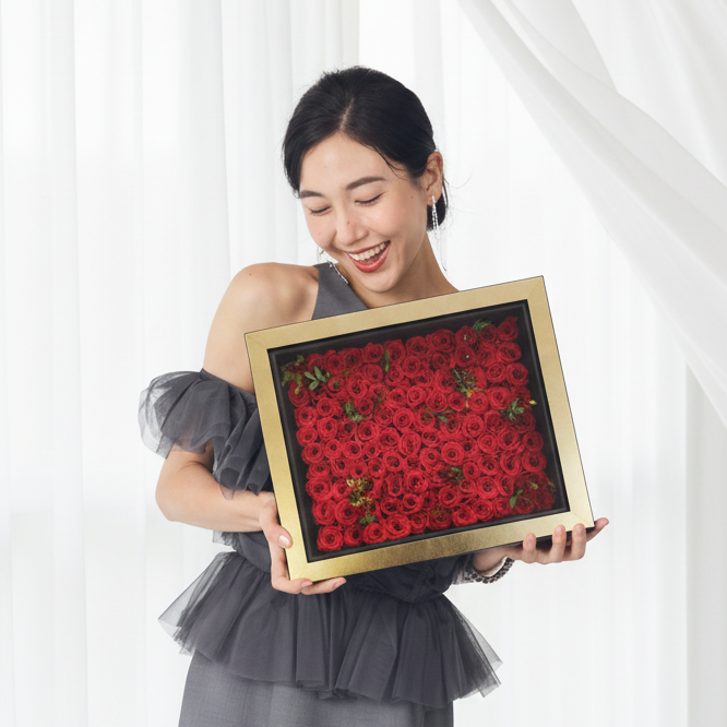 108本という特別な本数の薔薇を、熟練の職人が丁寧に配置。立体感のある美しいデザインで、あの日の想い出を色鮮やかに保存します。