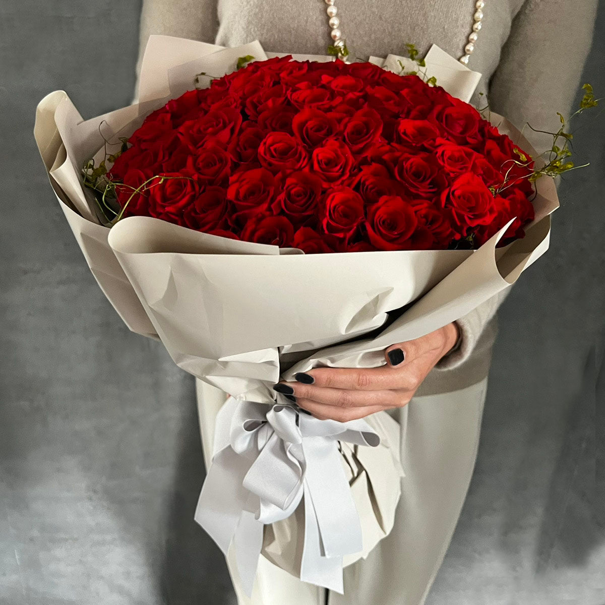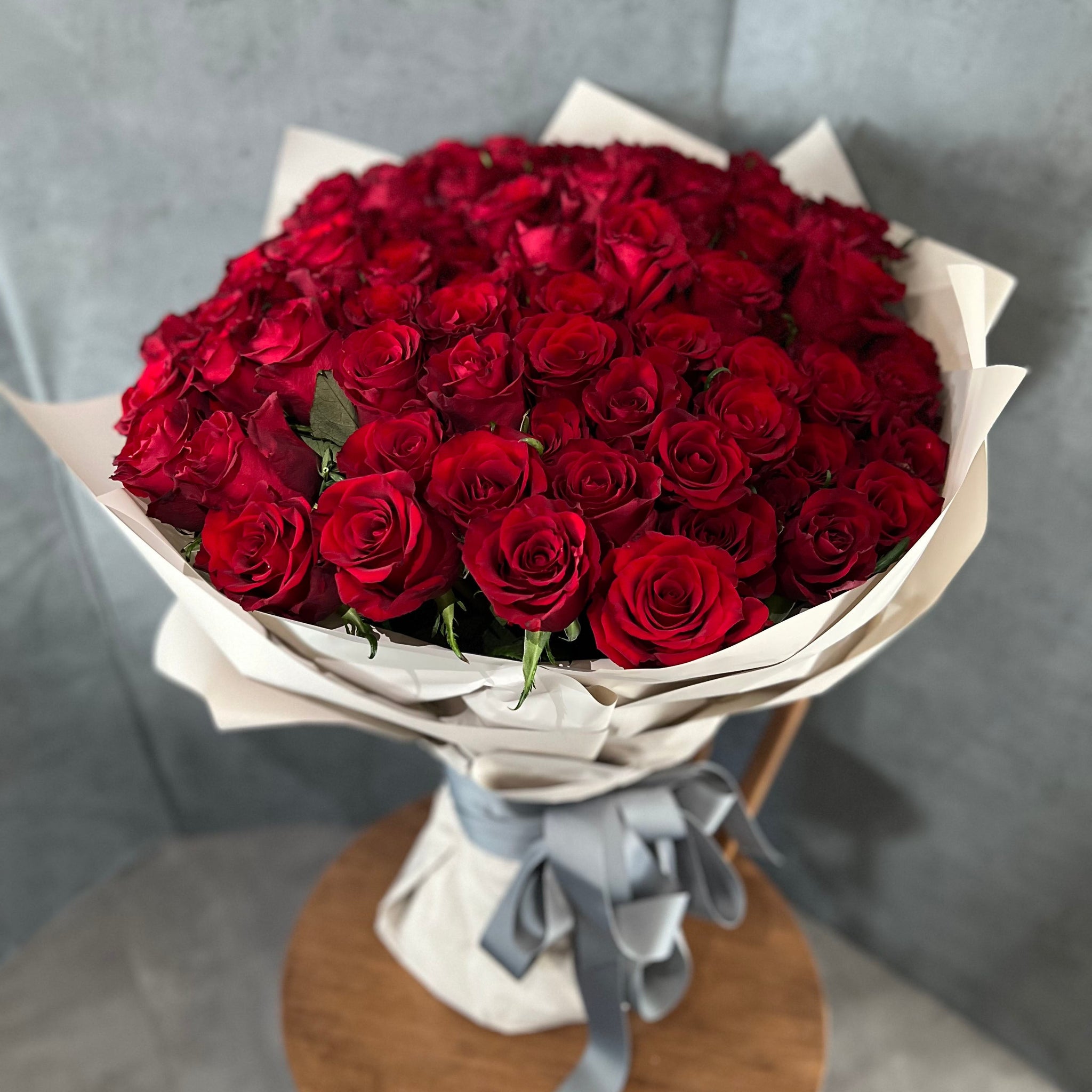 情熱的な真紅の生花の薔薇を108本贅沢に束ねた、圧倒的な存在感のブーケ。