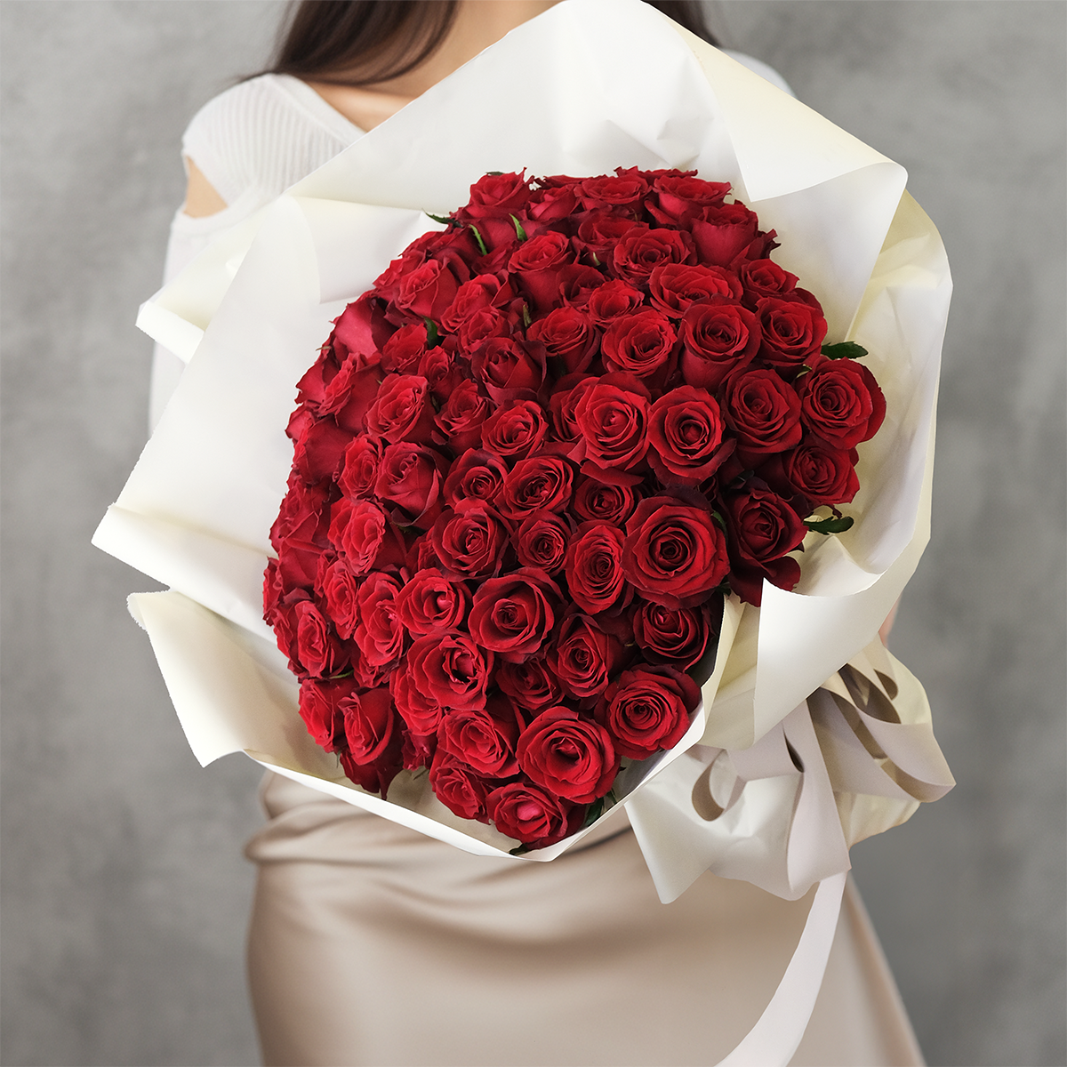 情熱的な真紅の生花のバラを108本贅沢に束ねた、圧倒的な存在感のブーケ。
