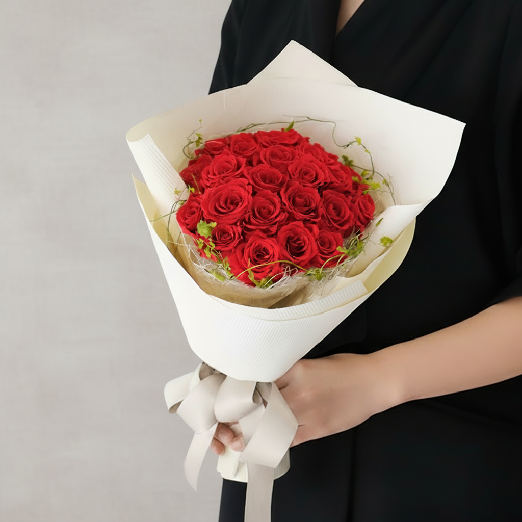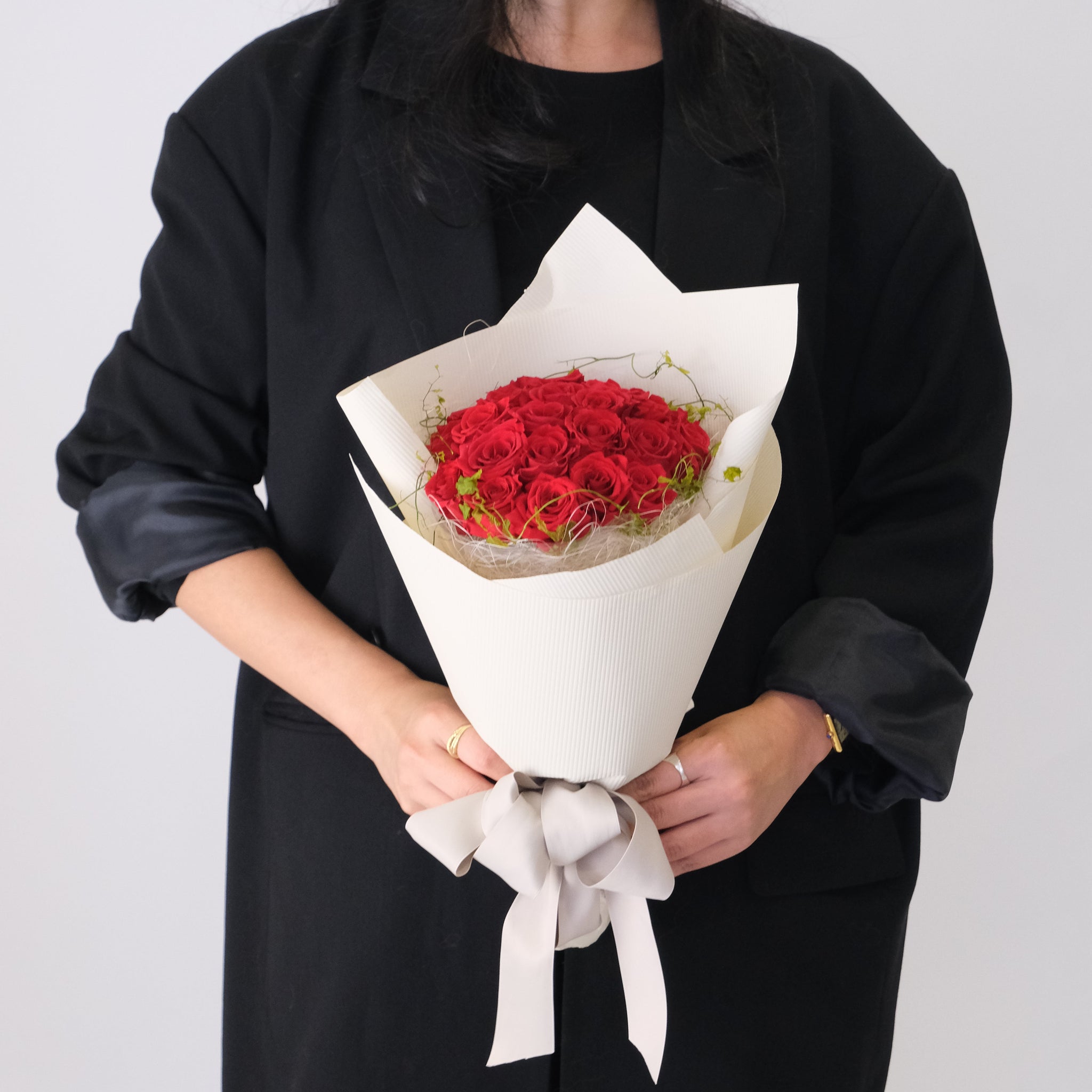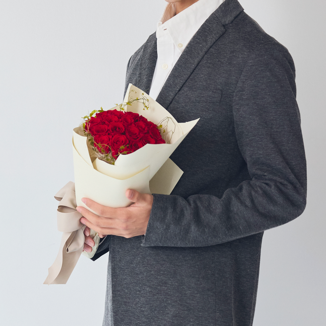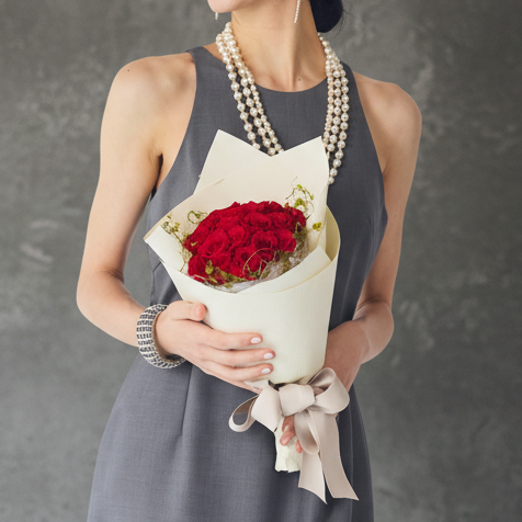 深紅の薔薇を24本束ねた、エレガントなプリザーブドフラワーブーケ。